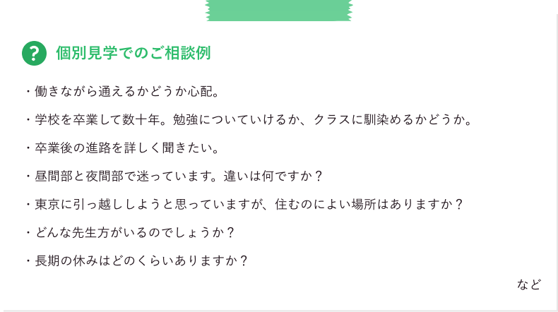 教職員が、学校内をご案内しながら、皆さまが抱えている不安やお悩みなど個別のご質問にお答えします。
