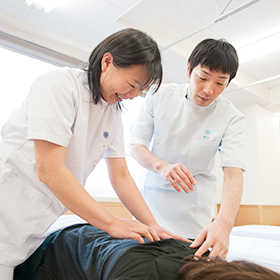 実技授業では、学生は二人一組で交代で練習台になり、例えば「肩の張りに左右差がある。それはなぜか。どこを施術すればよいのか」というように、実際の症状に合わせて実践的に学べるようになっています。